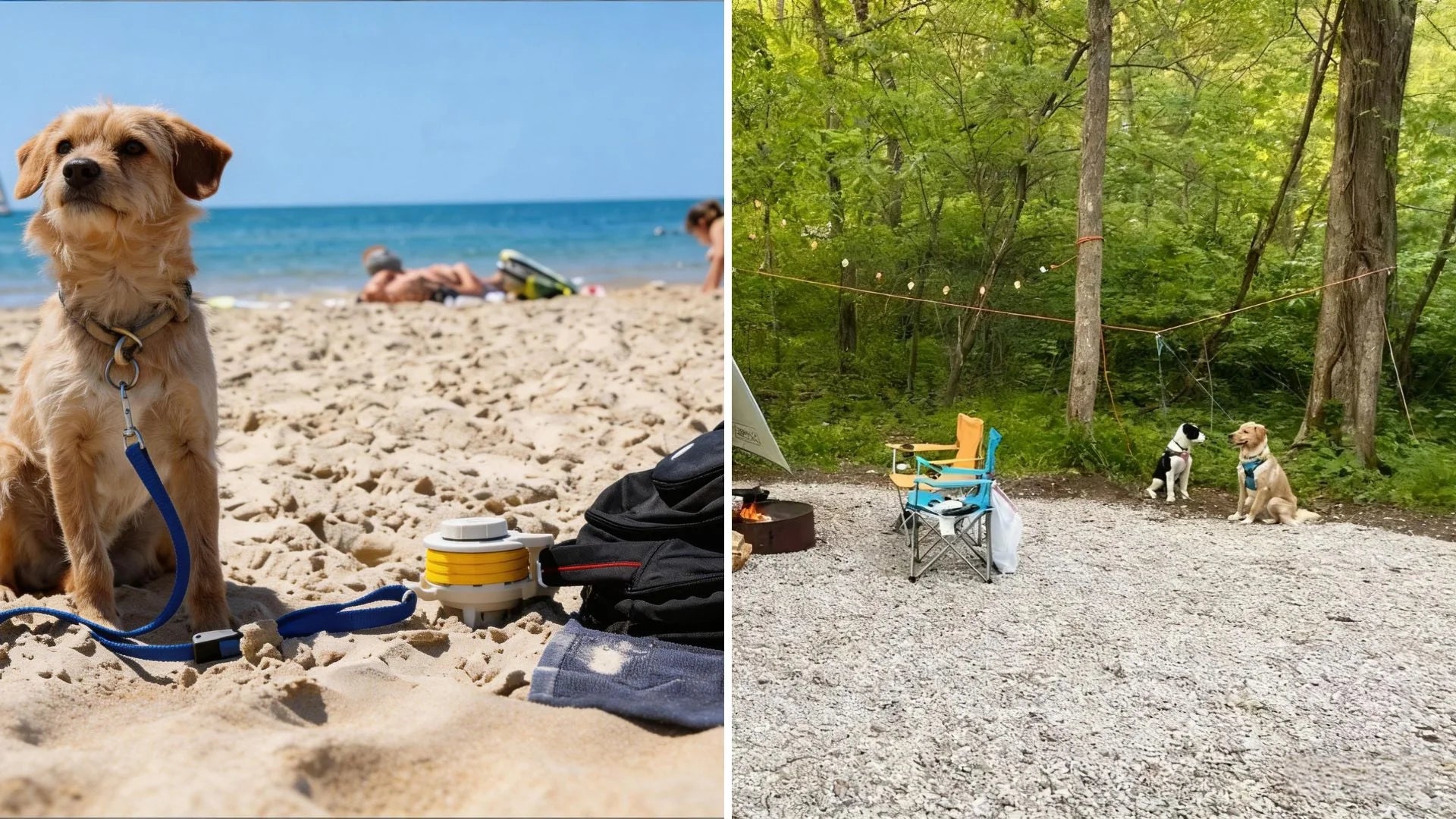 Camping (Wooded or Hard Ground ): Rocky or compact ground often prevents stake use. In these settings, a portable dog tie out that wraps around a fixed object works better. A tree strap system allows you to secure the line to a tree trunk, picnic table, or other solid structure. This setup avoids relying on ground anchors.