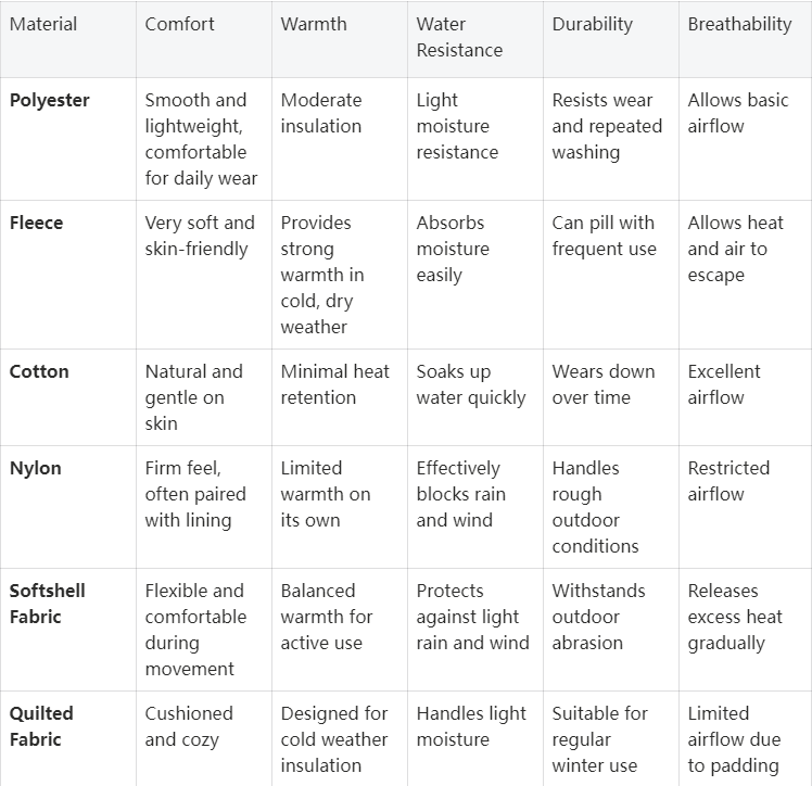 When evaluating dog coats, material choice plays a critical role in overall performance. Different fabrics offer different strengths in terms of comfort, warmth, weather protection, and durability, which is why understanding common dog coat materials is essential. Rather than relying on appearance alone, effective dog coat design considers how each fabric performs in real outdoor conditions, from cold temperatures to moisture and extended wear. The table below compares six commonly used materials in dog coats across key performance factors.